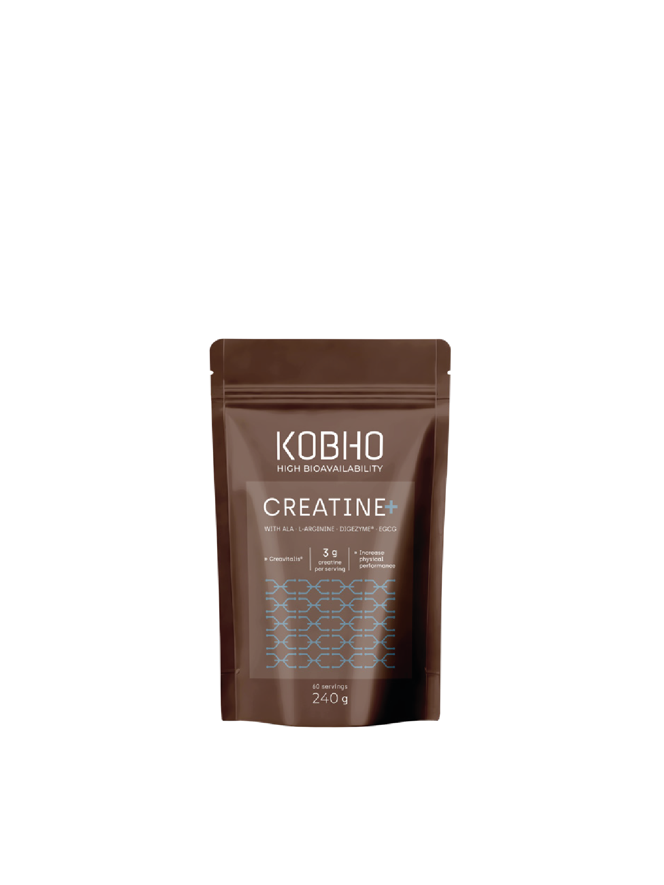 Monohidrato de creatina Creavitalis®, L-arginina, complejo multienzimático DigeZyme®, ácido R-alfa lipoico, goma arábiga y extracto de té verde rico en EGCG.